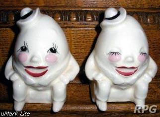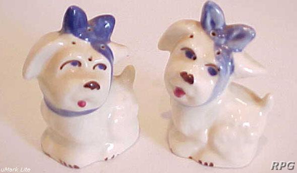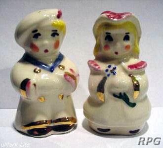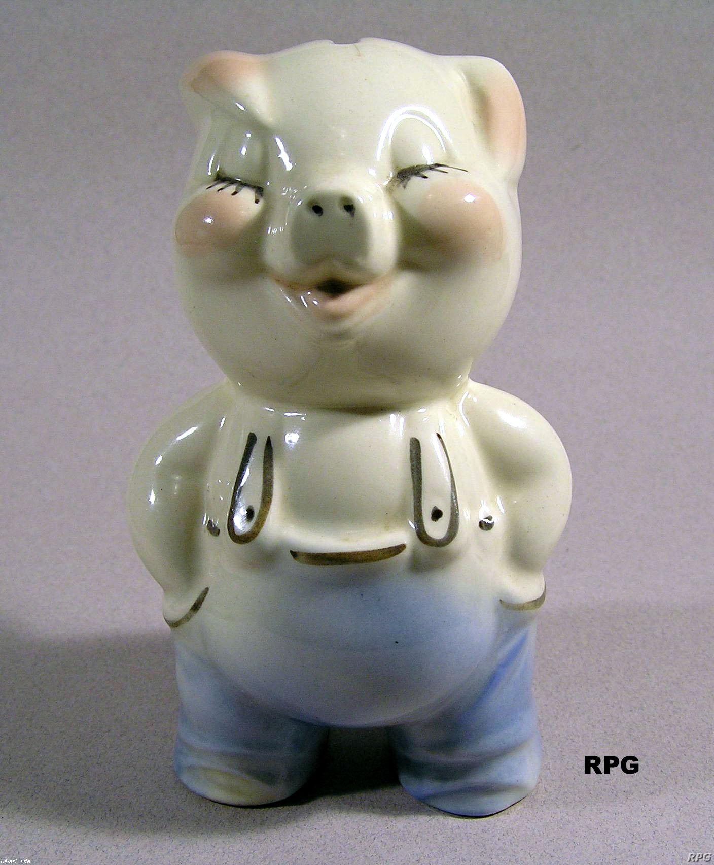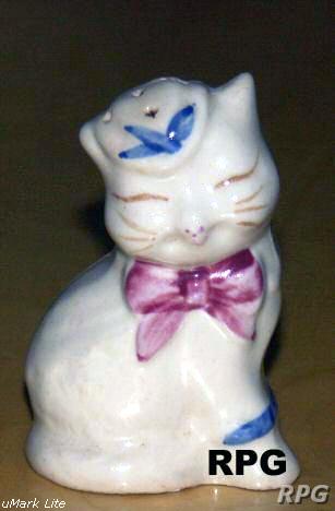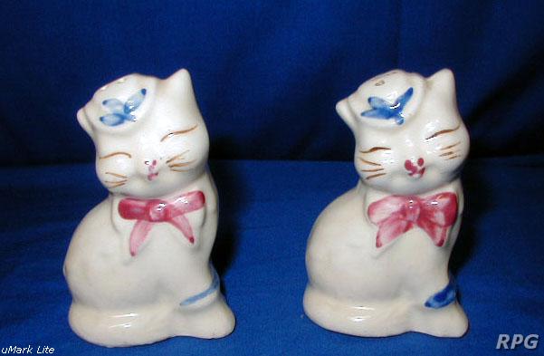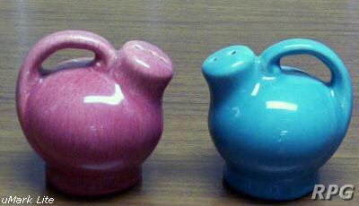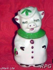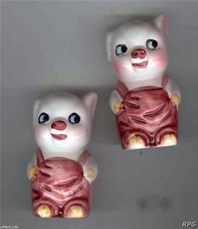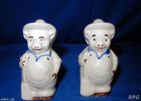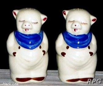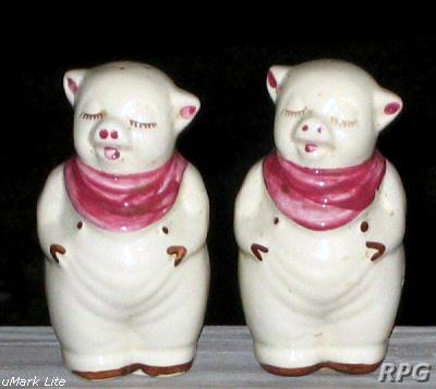 Please allow time for the images to load. Shawnee did not make a large number of different salt and shakers in the pig and animal shapes but there some things you need to know. First, There were two different sizes made of some of the salt shakers. One set was 3 1/4 inches high and one set was 5 1/4 inches high. Second the items with gold trim demand a higher price. Finally the small set had three larger holes for the salt and smaller four holes for the pepper. In the larger sets the salt had four larger holes and the pepper has five smaller holes. There are excepts to this so don't depend on this as a stand alone test. But if you have two pieces with the same size and number holes then you have two salt or pepper shakers.