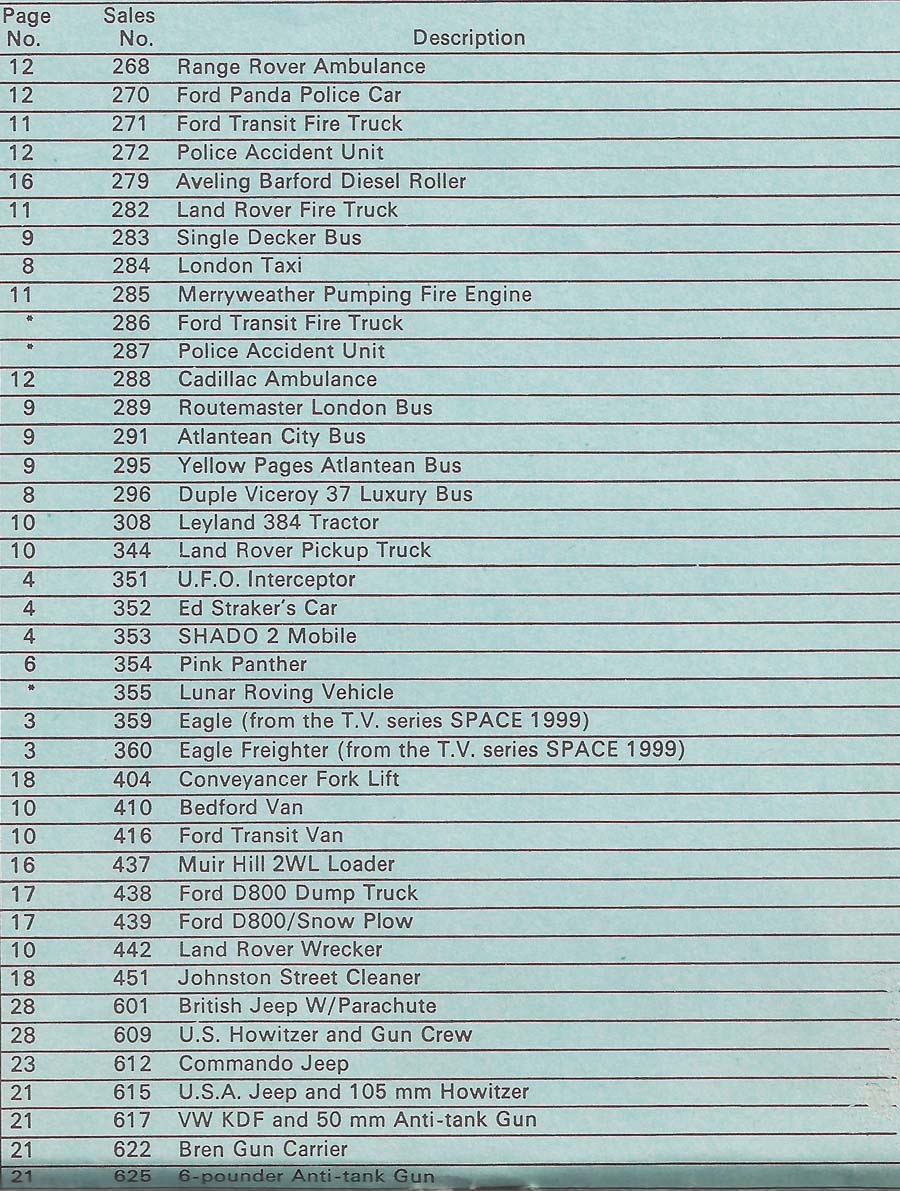 The following list which covers four pages is a list of the vehicles that are included in the 1973 Dinky catalog. The list shows the number of the vehicle, the page number where it is located and a description of the vehicle.