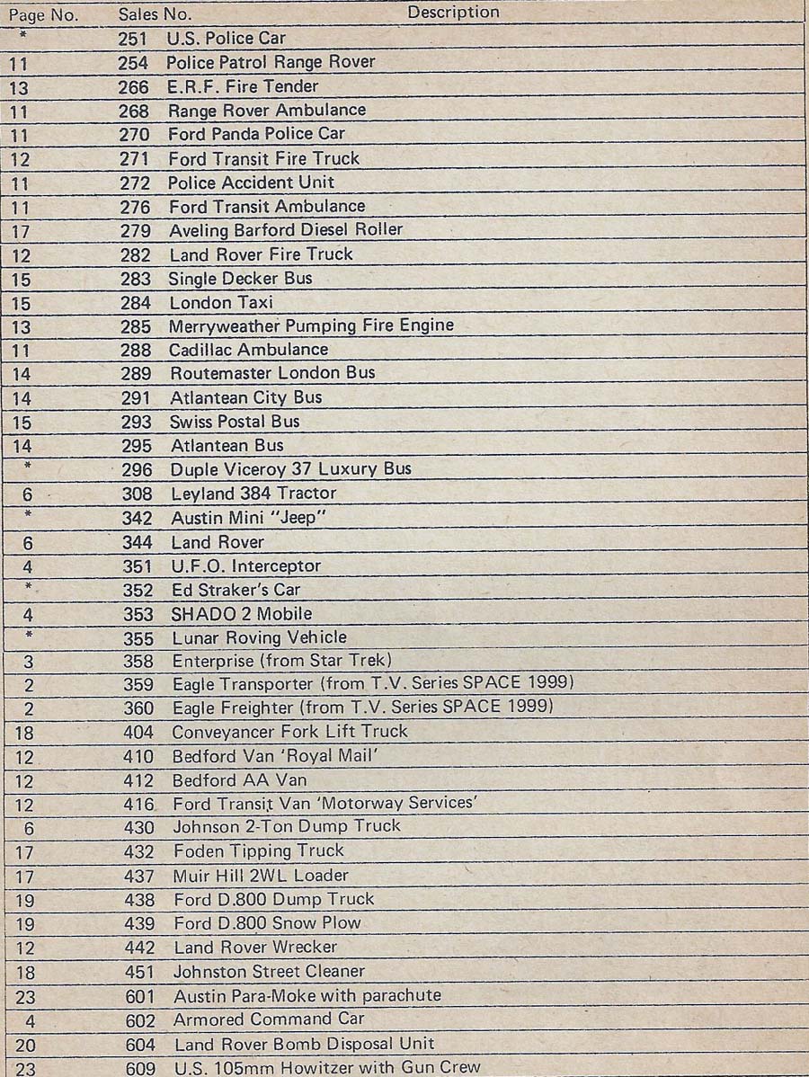 The following list which covers four pages is a list of the vehicles that are included in the 1973 Dinky catalog. The list shows the number of the vehicle, the page number where it is located and a description of the vehicle.