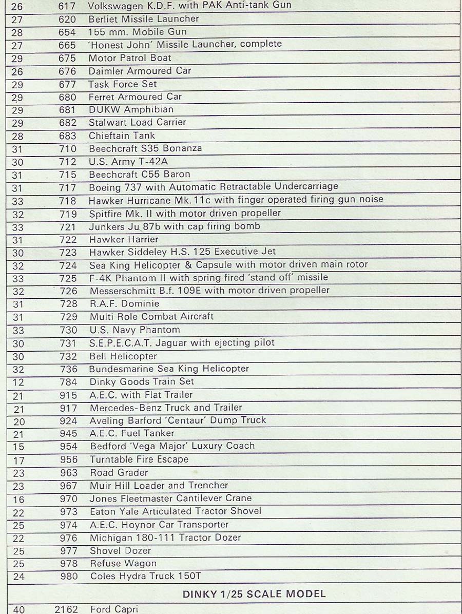 The following list which covers four pages is a list of the vehicles that are included in the 1973 Dinky catalog. The list shows the number of the vehicle, the page number where it is located and a description of the vehicle.