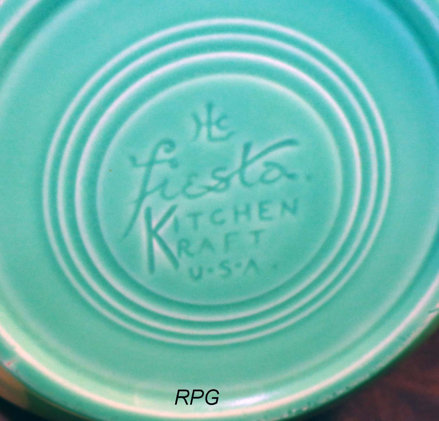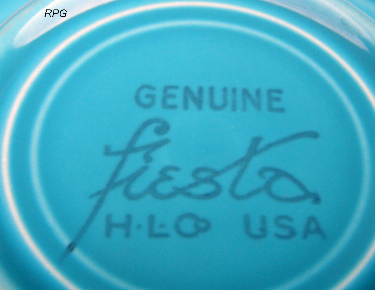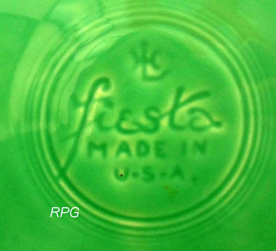 The original molds from the 30s were used in the production of the new Fiesta after 1986. This causes some problems with identifying the pieces as the earlier 1986 forward pieces had the same markings as the older pieces. Later on these indented pieces a ink stamp was also added. So to identify what you have you need to understand the colors used at the beginning and what colors were available in 1986.