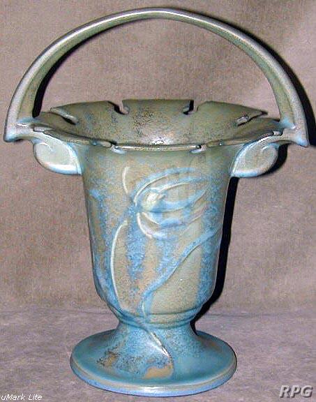 Blended colors of blues, pinks, ivory and brown. Impressed marks.