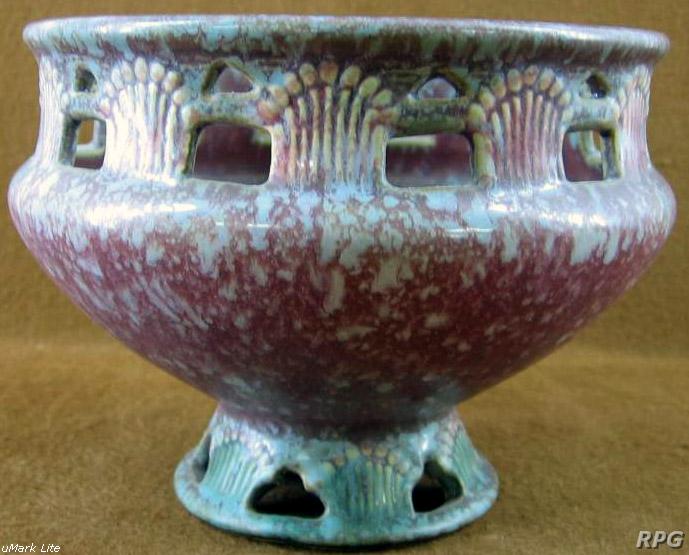 Pierced borders and footed bases. Unmarked or paper label. Brown/tans