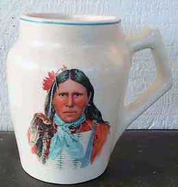 Creamware mugs and tankers with decals of Indian chiefs and Indians with clear matt glaze over the decals unmarked.