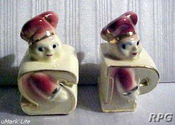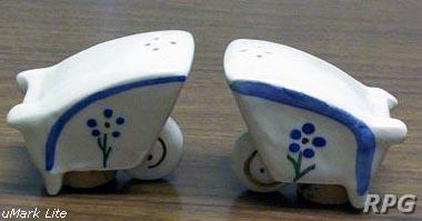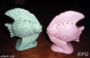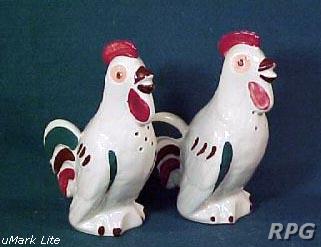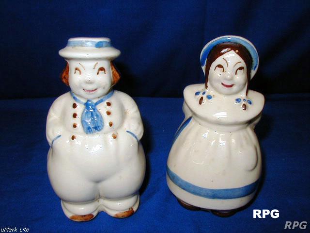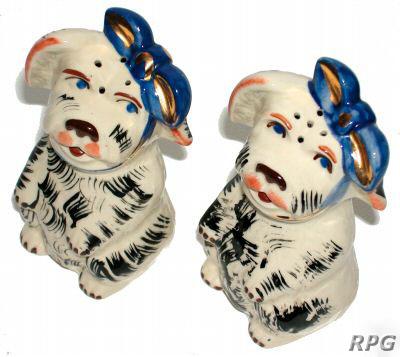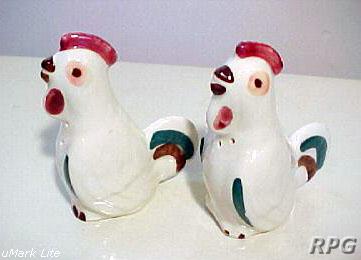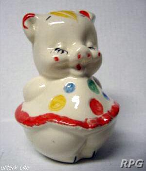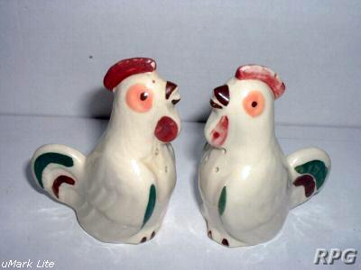 Please allow time for the images to load. Shawnee did not make a large number of different salt and shakers in the pig and animal shapes but there some things you need to know. First, There were two different sizes made of some of the salt shakers. One set was 3 1/4 inches high and one set was 5 1/4 inches high. Second the items with gold trim demand a higher price. Finally the small set had three larger holes for the salt and smaller four holes for the pepper. In the larger sets the salt had four larger holes and the pepper has five smaller holes. There are excepts to this so don't depend on this as a stand alone test. But if you have two pieces with the same size and number holes then you have two salt or pepper shakers.